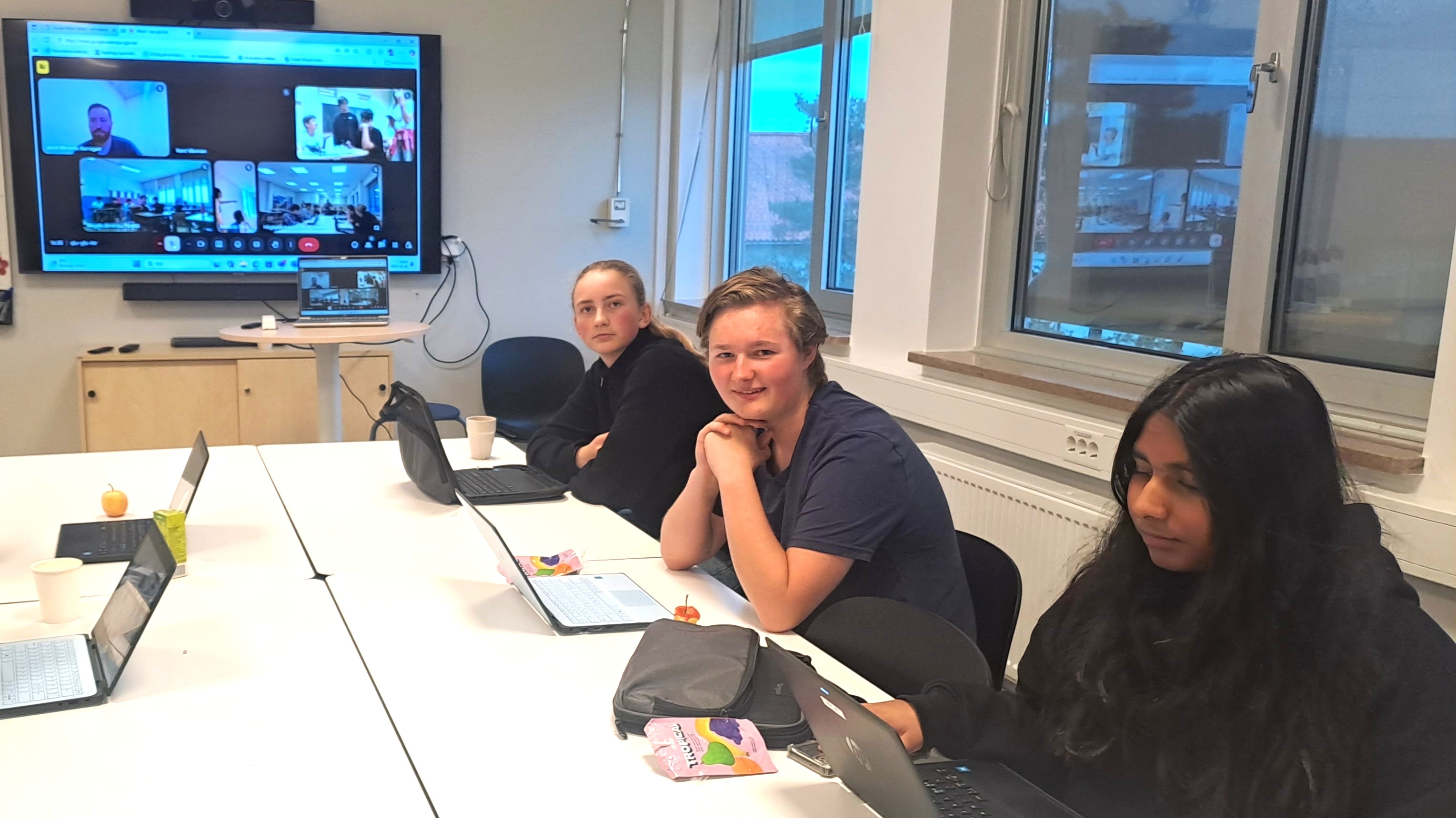 Alve Möller, Unne Sutare och Orin Aktar, tre av Högby-eleverna som deltog i turneringen. I bakgrunden syns de andra skolorna på det videomöte som pågick under turneringen.