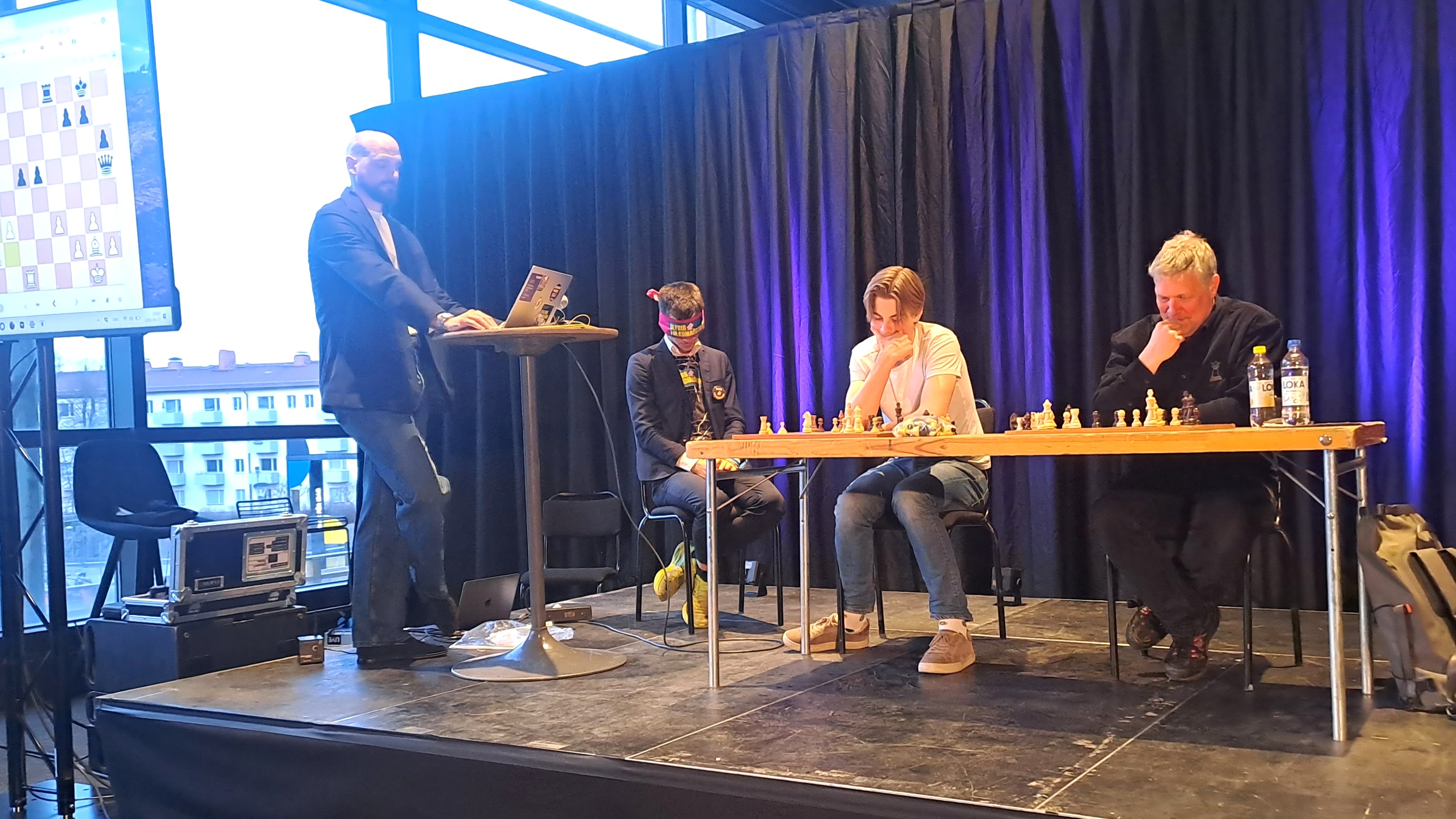 GM Axel Smith med ögonbindel mot Frank Blom och Marcus Uneson från Visby SK: