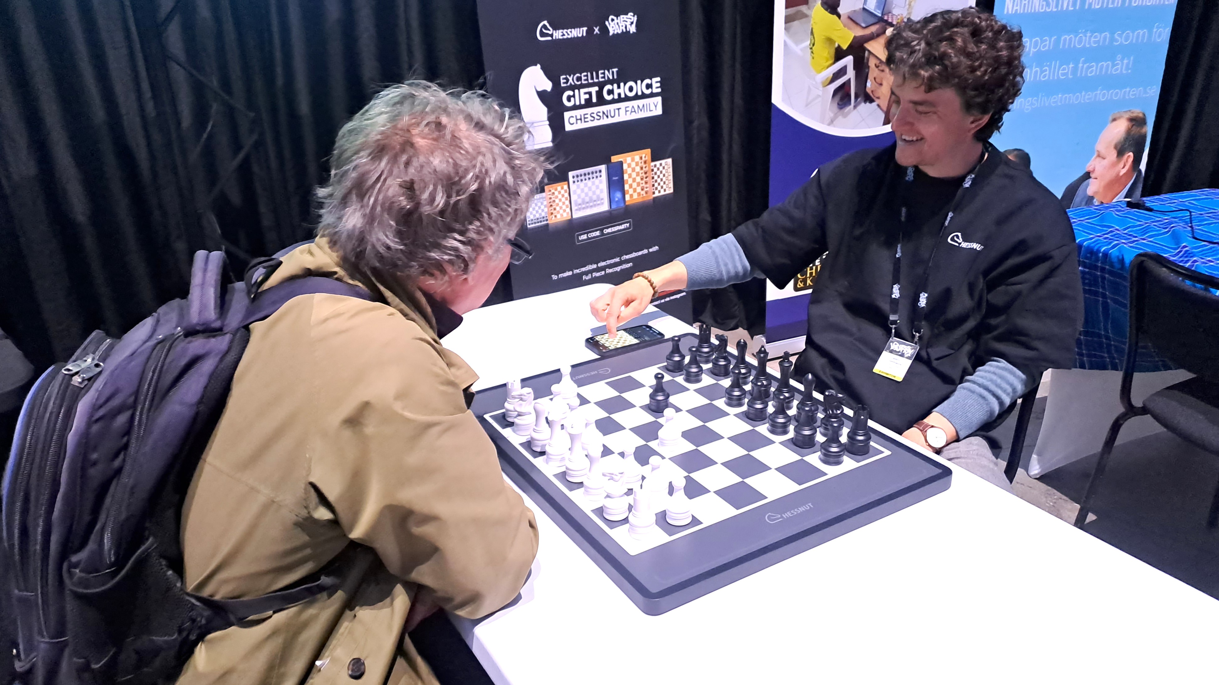 Lasse Linusson i kamp mot belgisk man, som spelar på telefonen varpå pjäserna rör sig på det stora brädet.