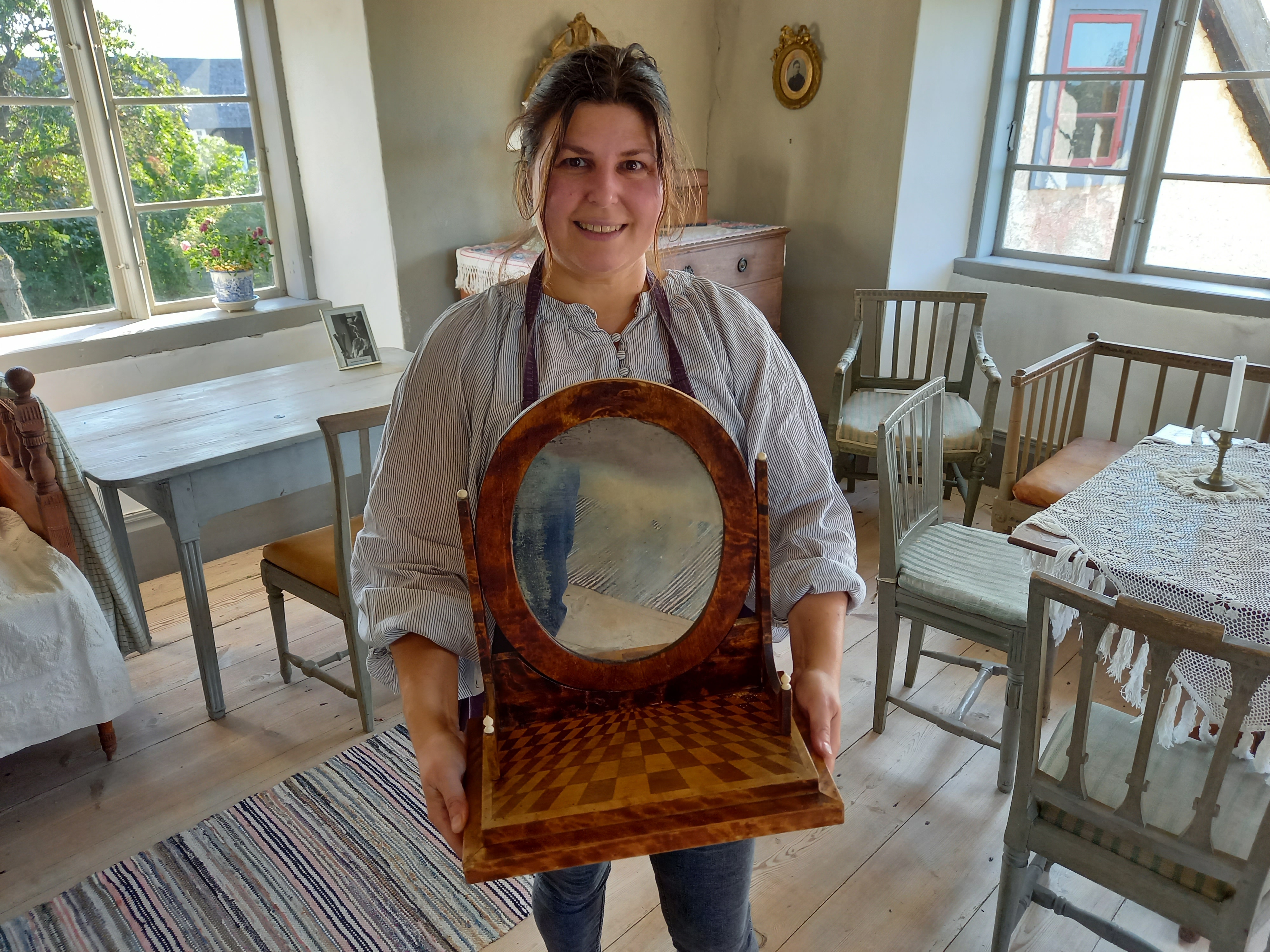 Henriett Csikos driver Petesgården tillsammans med sin man Robert Balogh. Spegeln från museet tillhörde Ada Block, Sveriges första kvinnliga apotekare, och den vars liv och leverne museet skildrar. Observera schackmotivet!